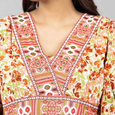 This Bohemian-style long kurti brings a touch of modern elegance with a relaxed and comfortable fit.